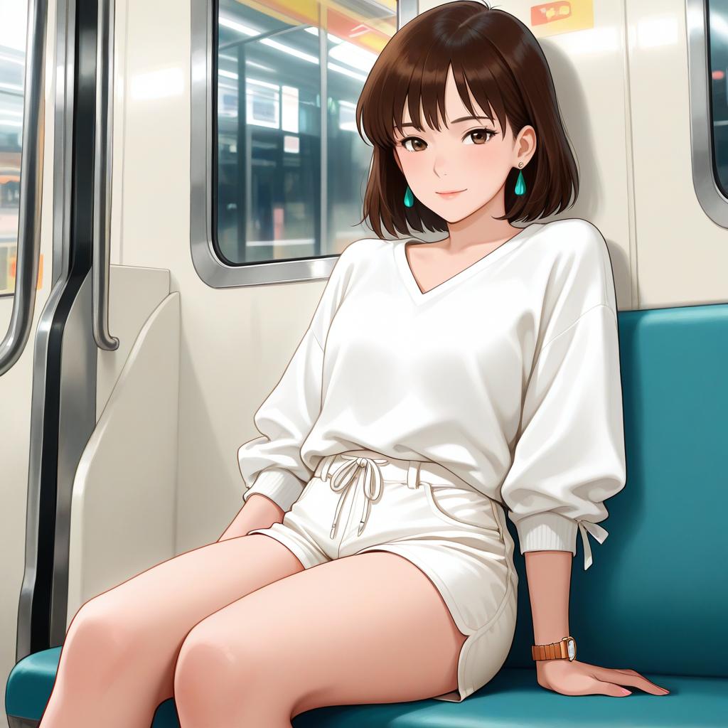 A detailed and realistic digital illustration of a young woman with brown hair sitting in a subway car. She is wearing a classic white long-sleeve top and white shorts, accessorized with a wristwatch and dangling earrings. The setting is an urban subway with visible metal poles and blue seats, rendered in vivid colors with intricate textures. The woman has a delicate pose and an expressive, contemplative demeanor, showcasing contemporary casual fashion and youthful features.