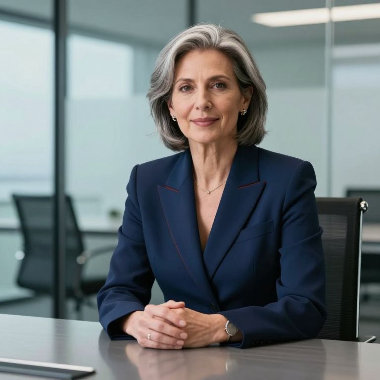 A high-achieving business leader in her 50s with a wise, calm facial expression and silver-streaked hair, seated at a polished steel table in a glass conference room, wearing power-sharp tailoring with a bold silhouette — a navy suit with bold lines, high contrast, and structured cut, projecting strength and authority.