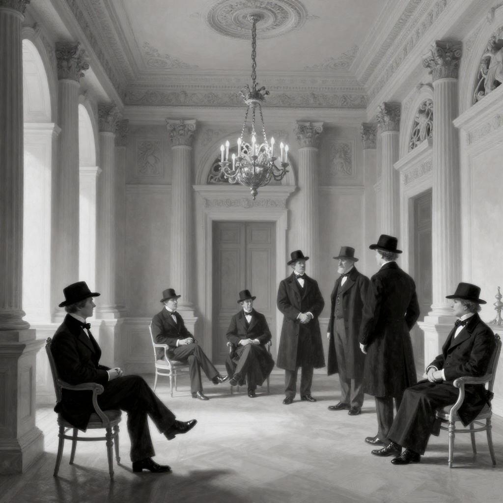 Black-and-white illustration of a grand, ornate room with tall columns and intricate ceiling details. Several people in 19th-century attire, including hats and long coats, are seated and standing, engaging in conversation. The scene is lit by soft, ambient light, creating shadows and highlights. The background features a large chandelier and decorative arches.