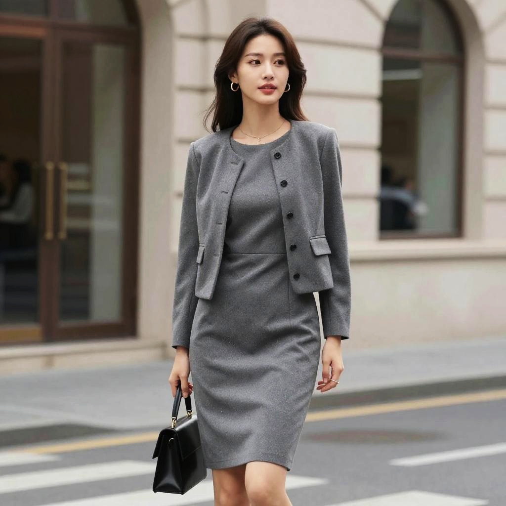Elegant Fashion, woman in a gray dress and jacket standing on a street