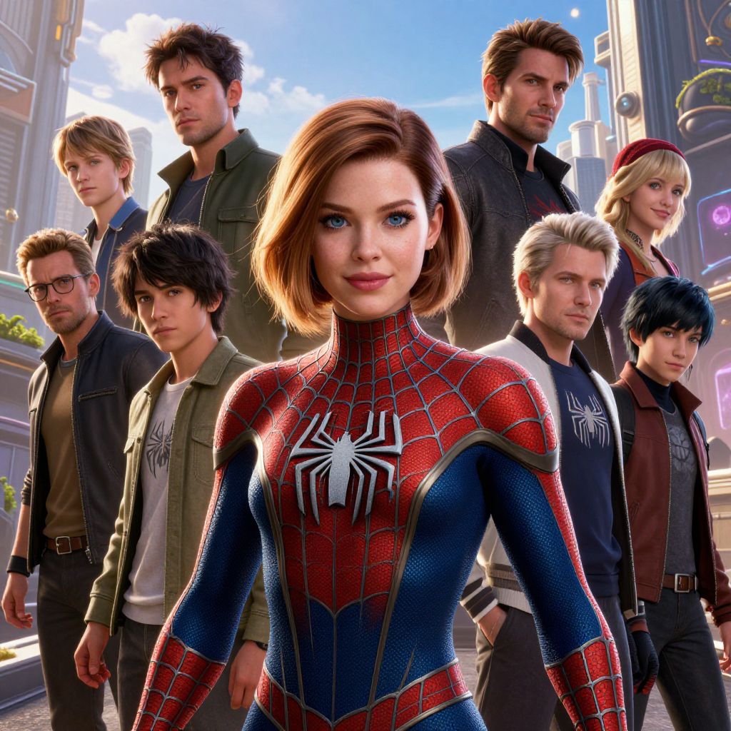 Franchise crossover illustration, characters and elements from several unique franchises interacting in a dramatic urban setting, dynamic poses, detailed backgrounds, vibrant contrasting colors, epic and cinematic style, high detail and depth