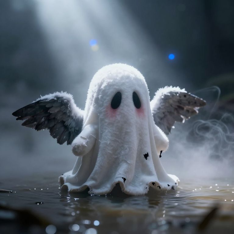 Digital artwork of a fluffy, white ghost with black wings and glowing eyes, standing in a misty, illuminated water scene.