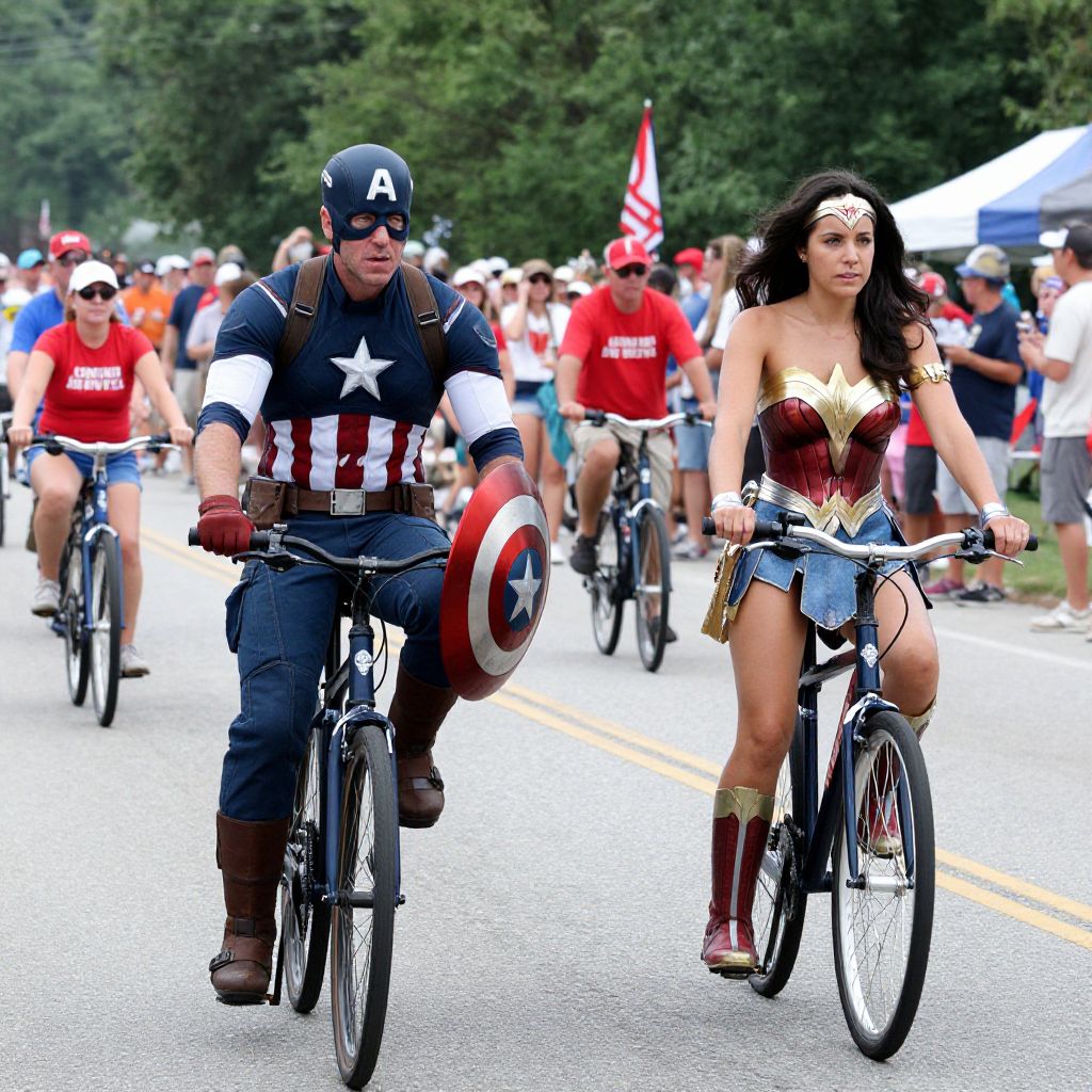 Captain America (Danny Silva) and Wonder Woman (Laura Silva) ride their bikes with the rest of the crowd as the Woodridge Indepence Day celebration makes it way up Woodrige Bluff on July 2, 2011. Photo by Marvin Pfeiffer