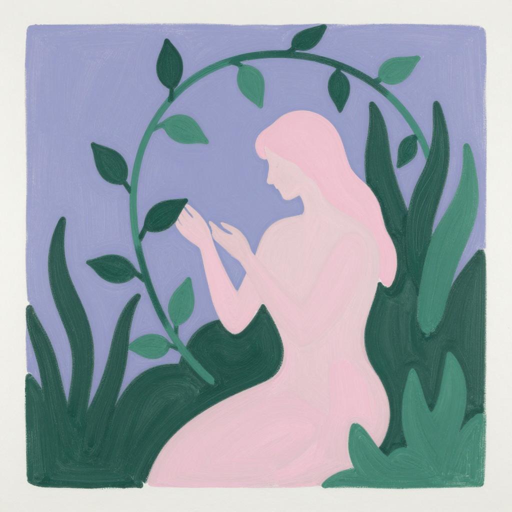 Abstract painting of a woman with pale pink skin and hair sitting amidst lush green foliage and delicate vines. The artwork features simplified shapes and fluid lines in a muted purple background, inspired by the style of Henri Matisse. The composition evokes intimacy and elegance through a bold yet soft color palette.