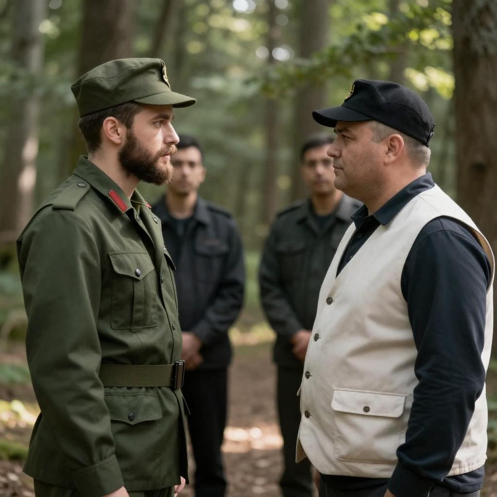 Photograph of a forest scene with three men. A man in a gray suit and cap, holding a cane, stands center, facing two soldiers in brown uniforms. One soldier on the left stands with arms crossed, while the other on the right holds the man's cane. Trees and greenery fill the background.