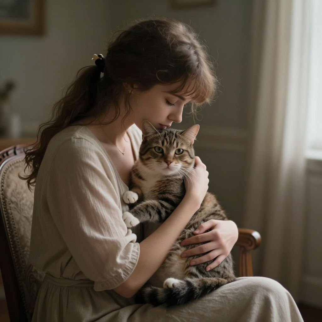In a quiet chamber draped in soft light, a woman in timeless elegance cradles a cat's gaze, their shared moment weaving a tapestry of serenity and timeless connection, where the warmth of touch and the stillness of breath evoke a profound sense of peace and mutual understanding.