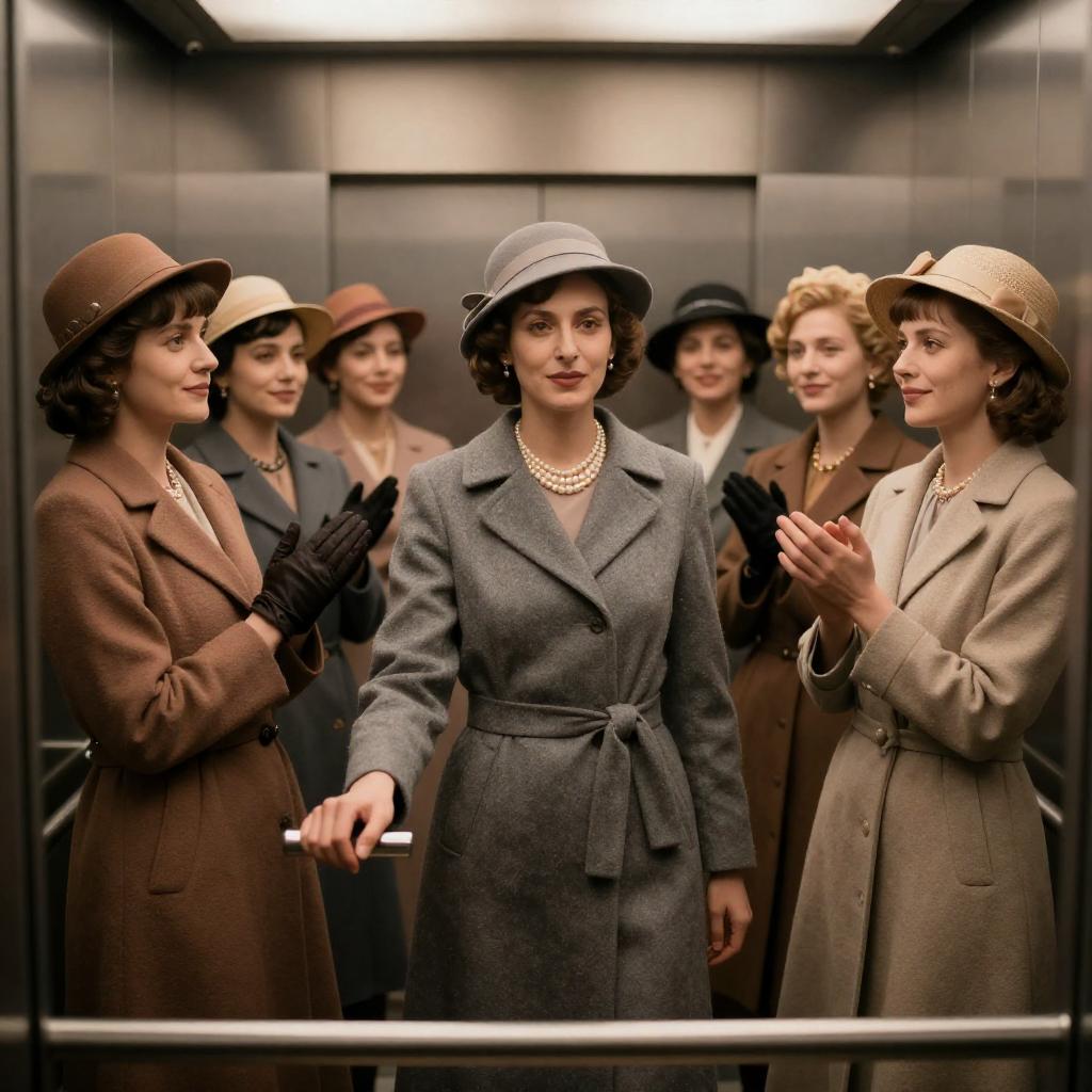 Photograph of four people standing outdoors. Three women in 1940s-style clothing, including a tan coat and hat, black dress, and dark blue dress, stand beside a man in a red checkered shirt, blue jeans, and cowboy hat. All hold suitcases. A yellow and red movie poster with a cowboy graphic is on the left. Background includes trees and a wagon wheel.
