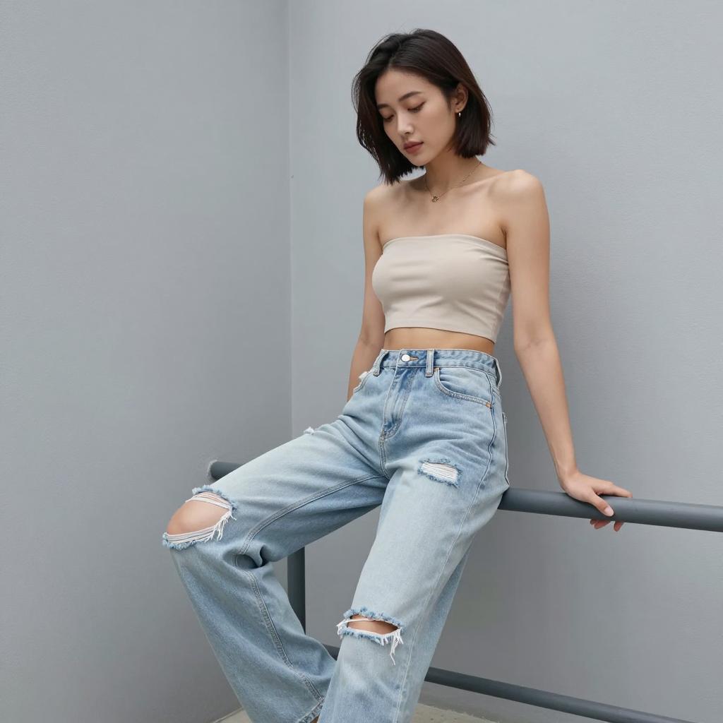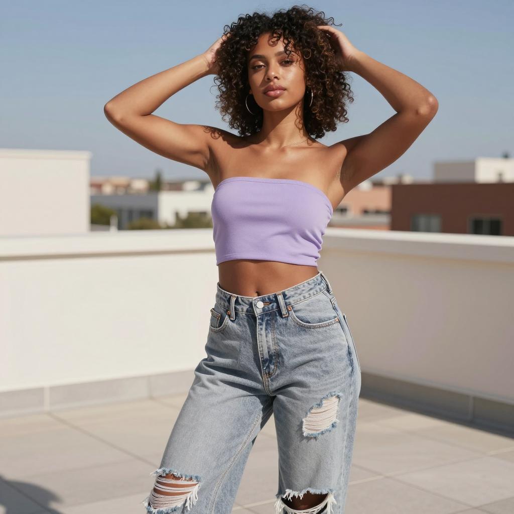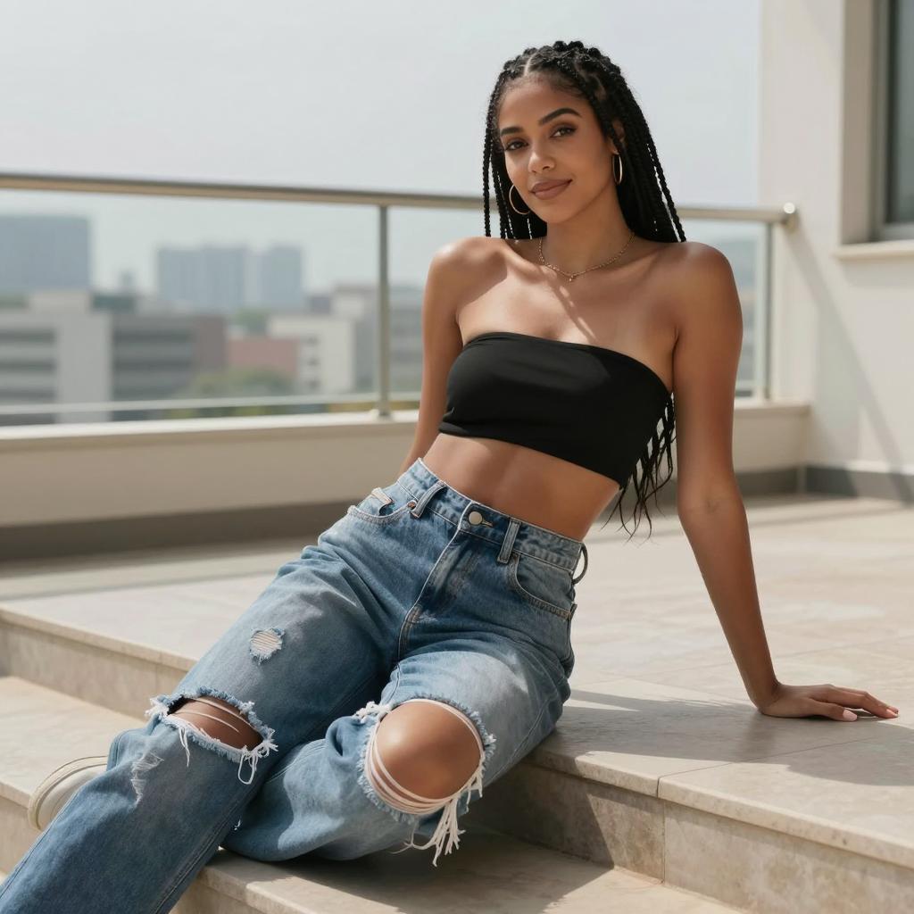 1girl, woman, wearing ultra-short bandeau crop top and high-waisted relaxed-fit ripped jeans in sky blue top with white ripped jeans on mixed-heritage woman with wavy ombré hair and soft glam posed sitting on a railing with one leg dangling, looking down thoughtfully in balcony scene overlooking a hazy city skyline under overcast daylight for even, low-contrast illumination, laid-back summer lifestyle fashion photography, high resolution, ultra-detailed
