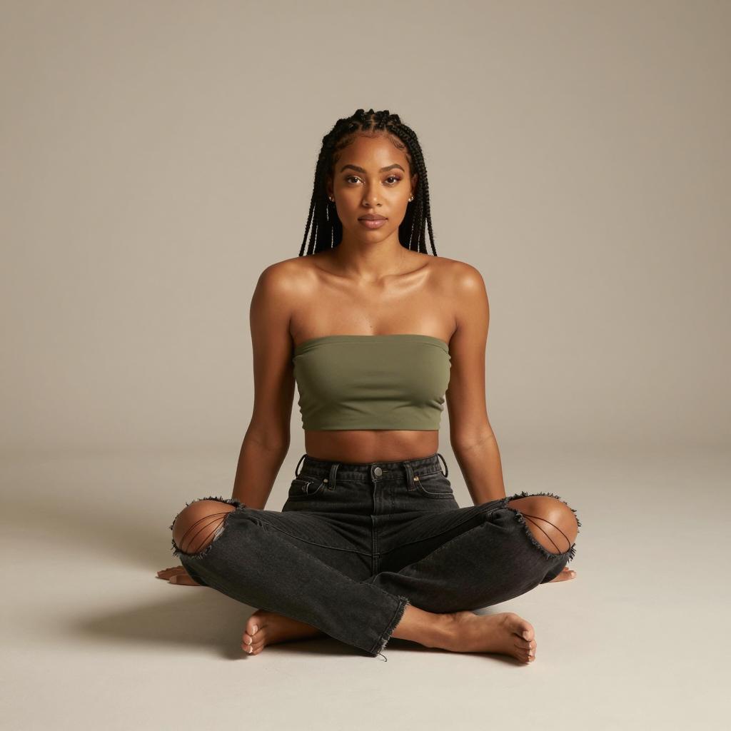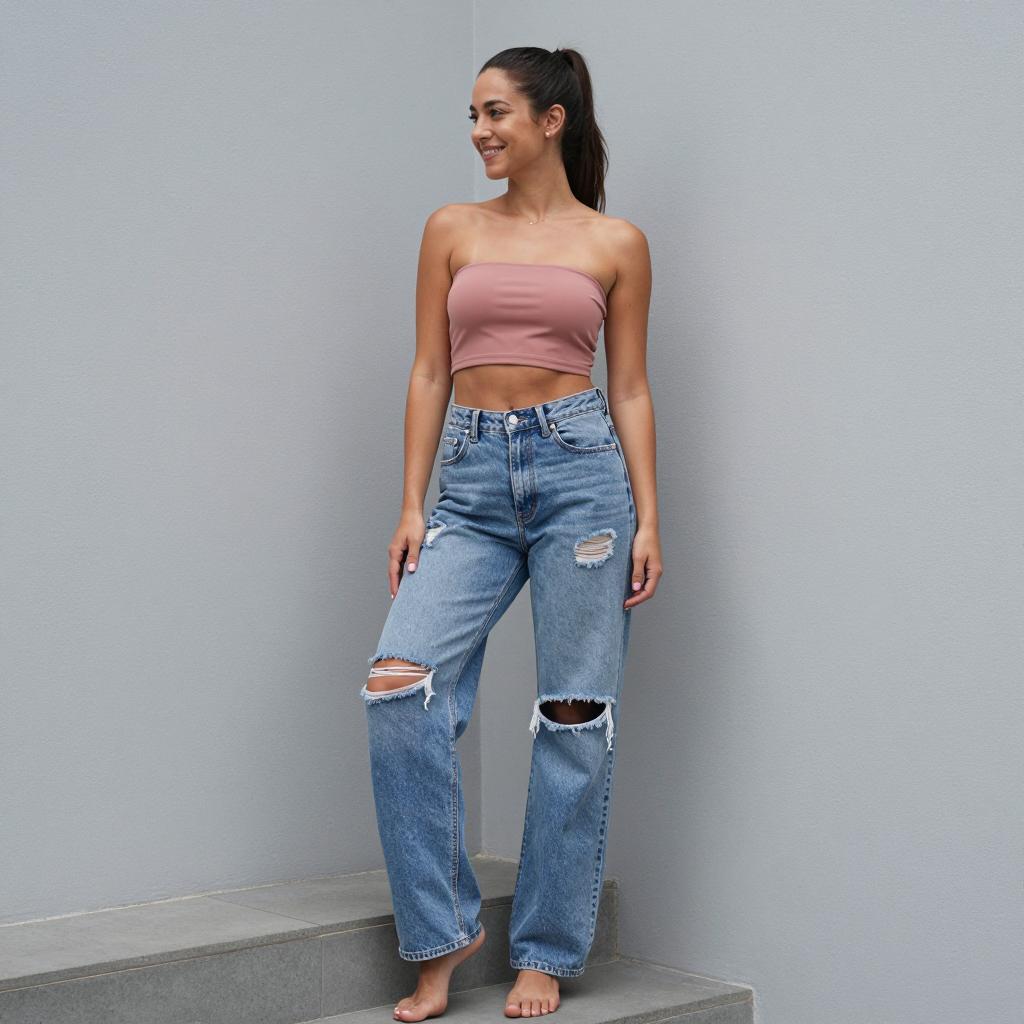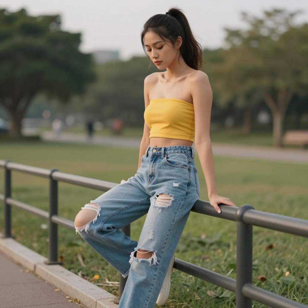 1girl, woman, wearing ultra-short bandeau crop top and high-waisted relaxed-fit ripped jeans in sky blue top with white ripped jeans on mixed-heritage woman with wavy ombré hair and soft glam posed sitting on a railing with one leg dangling, looking down thoughtfully in balcony scene overlooking a hazy city skyline under overcast daylight for even, low-contrast illumination, laid-back summer lifestyle fashion photography, high resolution, ultra-detailed