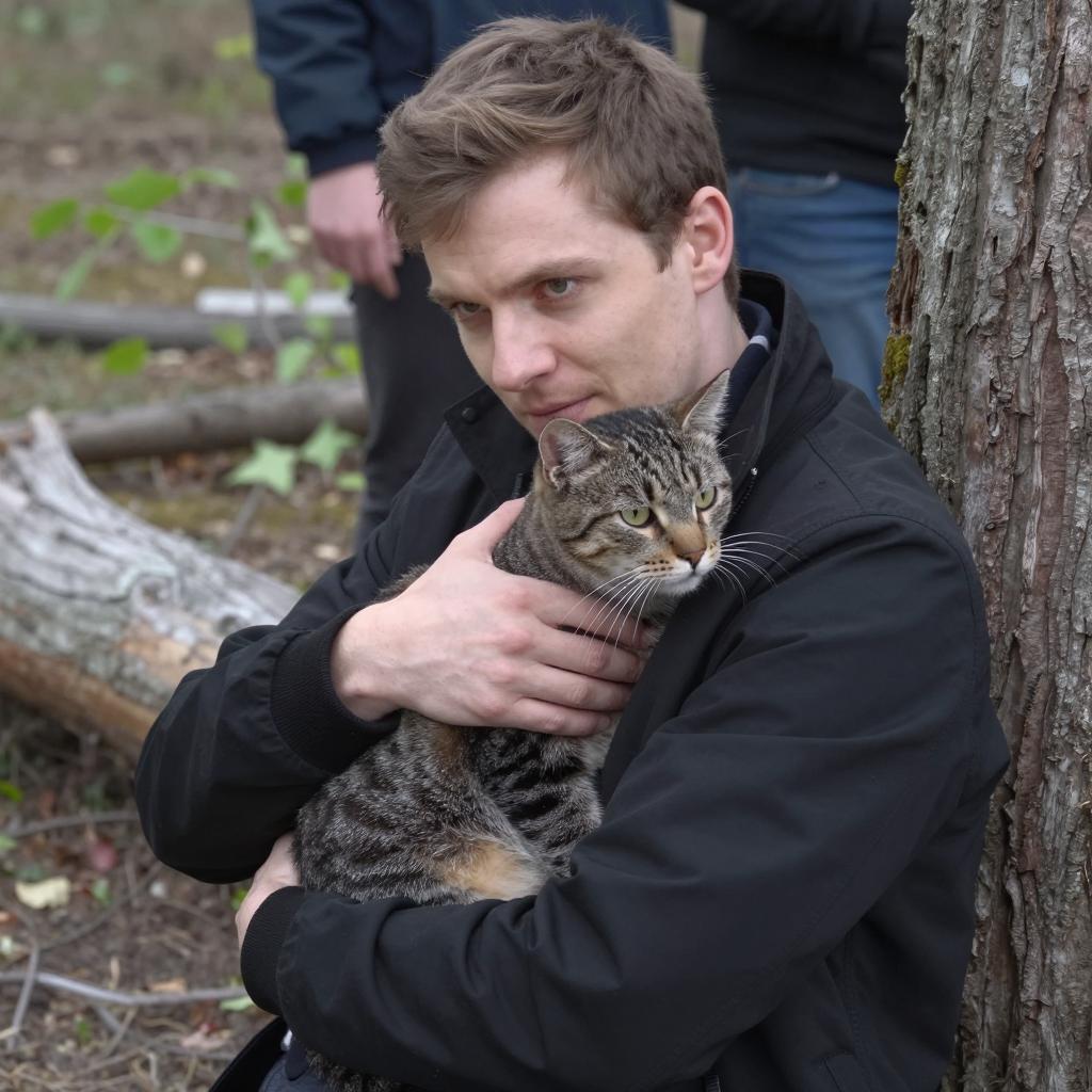 Young man with short brown hair, intense expression, pointing forward with right hand. Wearing dark green jacket. Forest background with tall, thin trees and dappled sunlight on grass. Shadow patterns on ground. Midshot, centered.