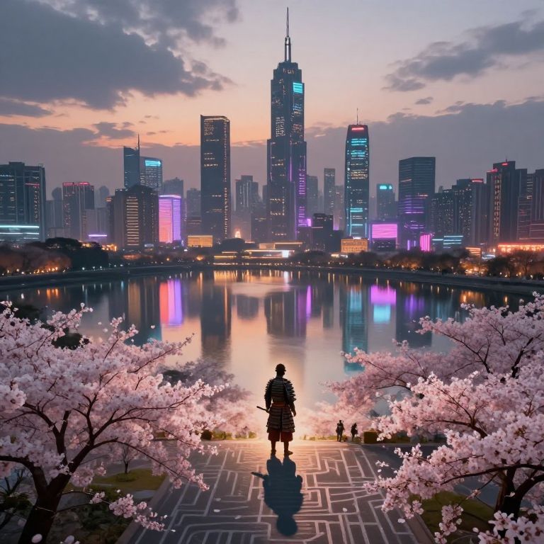 Digital artwork: Glowing dragonfly with sparkling wings over neon-lit cityscape at sunset, blending modern skyscrapers with traditional Asian architecture.