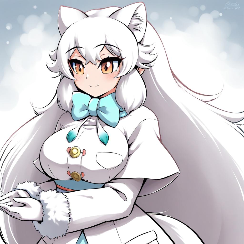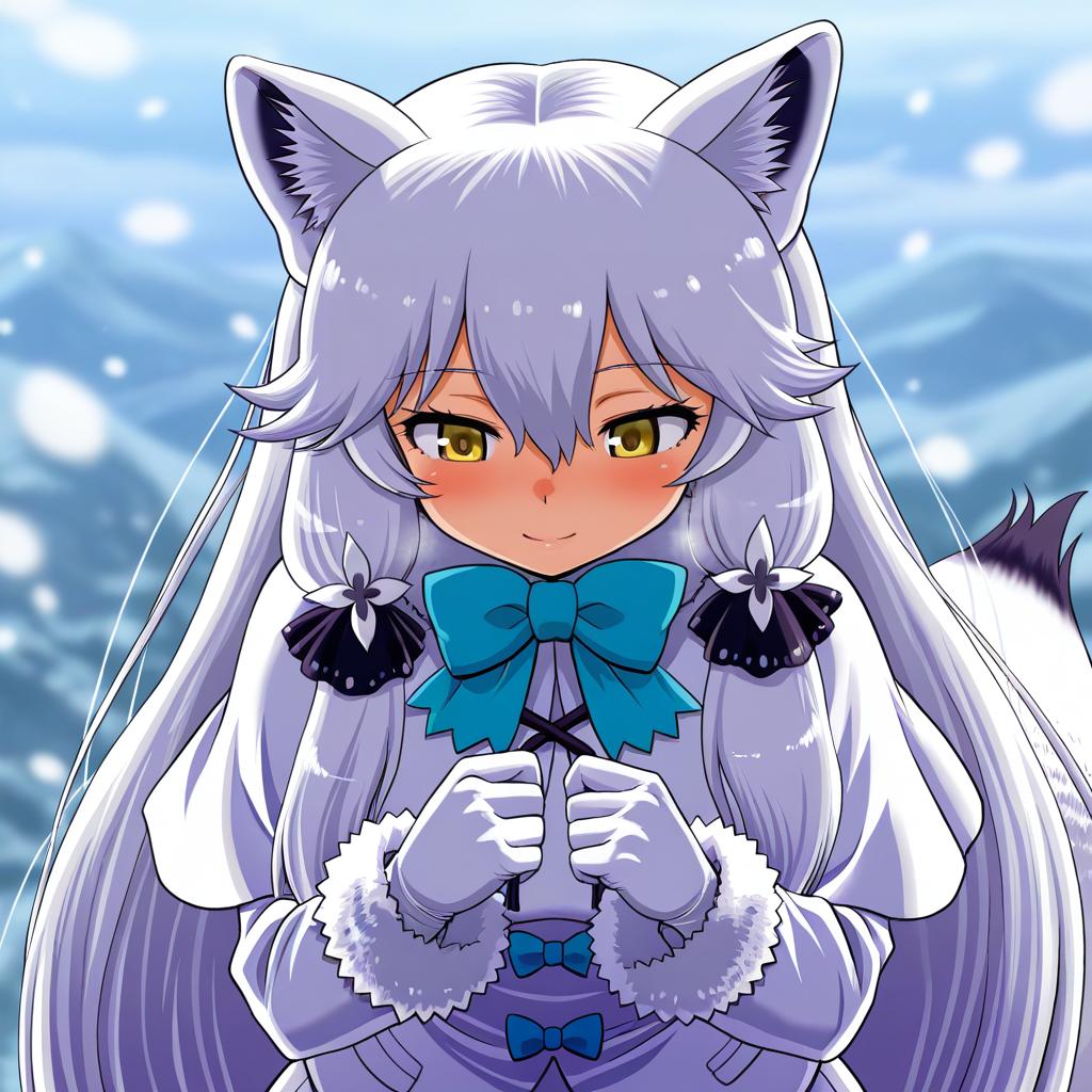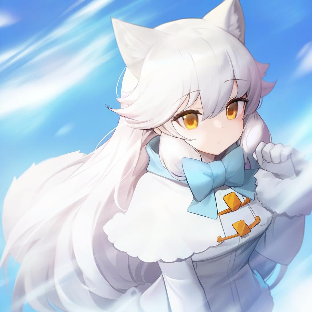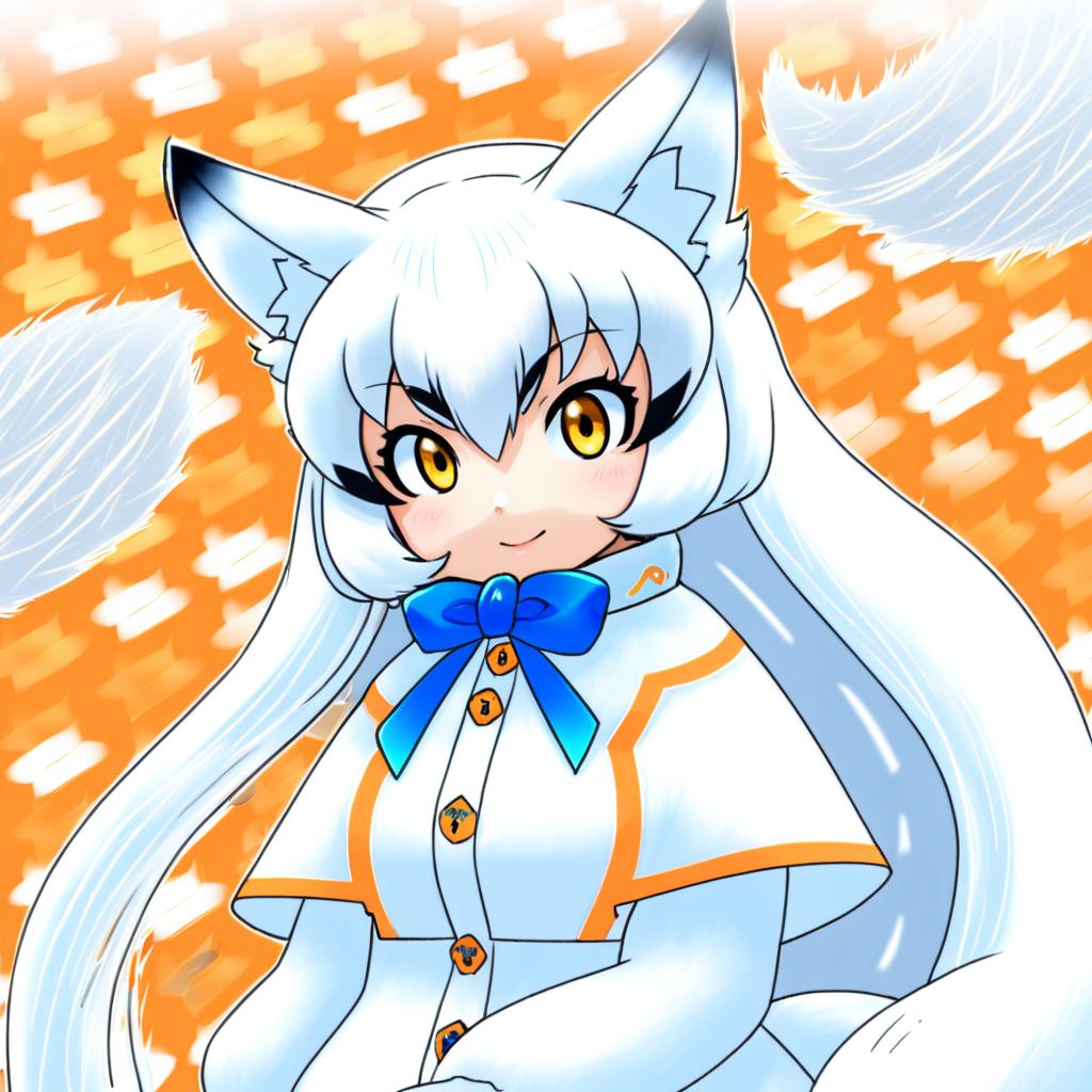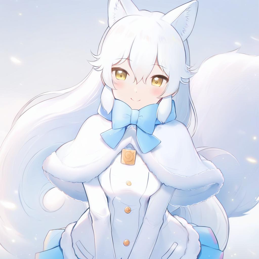 Arctic fox (kemono friends), kemono friends, 1girl, fox girl, fox ears, fox tail, extra ears, yellow eyes, hair between eyes, orange eyes, white hair, long hair, very long hair, sidelocks, white capelet, white gloves, long sleeves, blue bowtie, by artist yuumei, anime