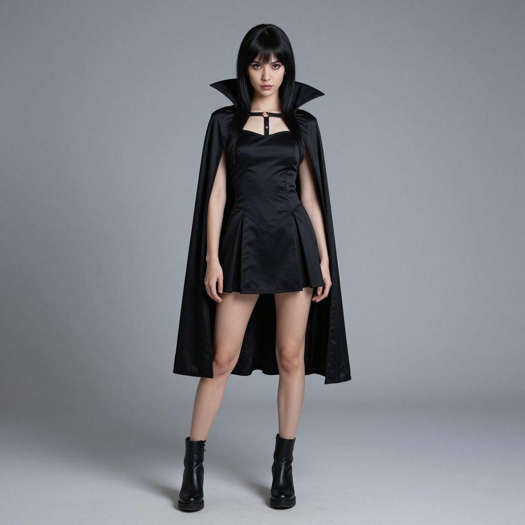 Photograph of a young woman with straight black hair, wearing a black dress, cape with high collar, and black ankle boots, standing against a plain