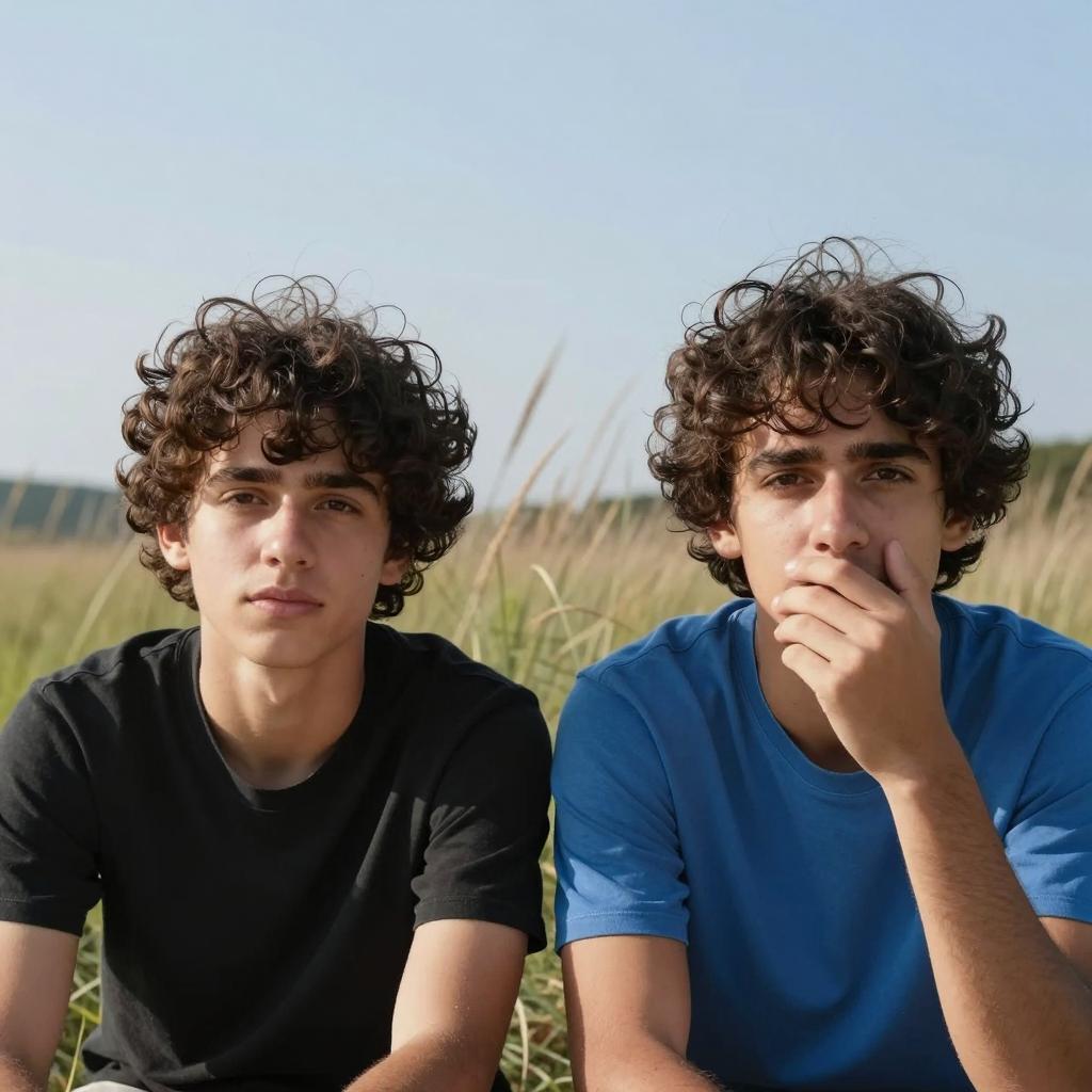 Three young men leaning on a car. The man on the left has brown hair, wears a dark shirt, holds a beer can. The middle man has curly brown hair, wears a gray shirt, smiles. The man on the right has short brown hair, wears a blue and white raglan shirt, blue cap, smokes a cigarette. Green trees in the background, bright daylight.