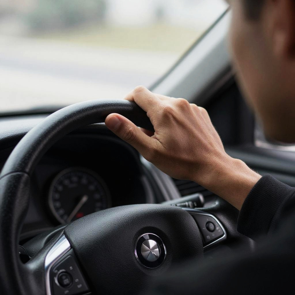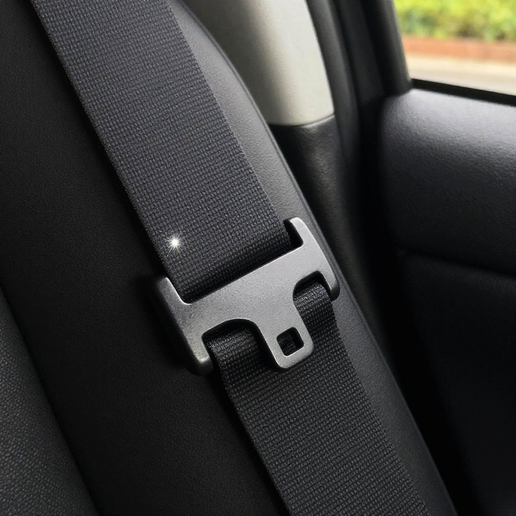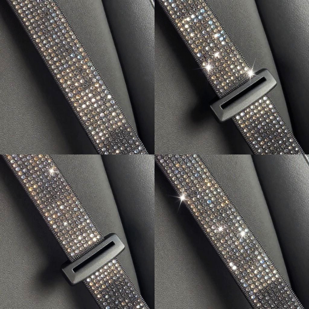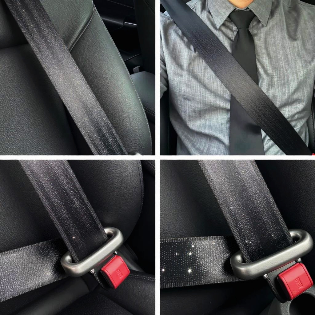 Close-up photo of a car seat showing a black seatbelt with a starry pattern. The seatbelt, which has small sparkling white dots resembling stars, is diagonally positioned across a black, textured car seat. The background is mostly white with grey borders on the sides. The image has a sleek, modern feel with a focus on the detailed starry design.