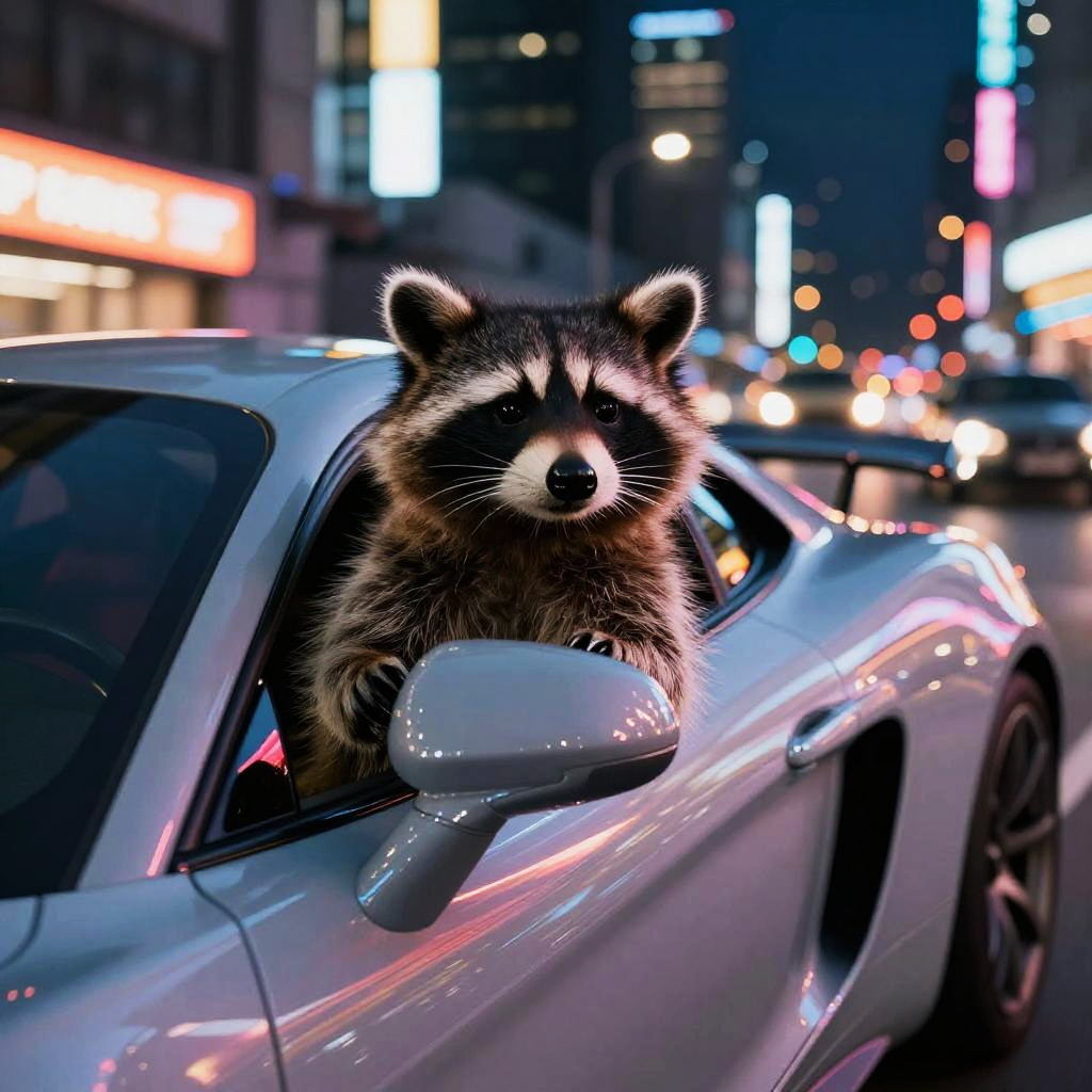 Racoon skateboard performing a trick mid-air against a twilight city skyline, neon lights reflecting on wet pavement, hyper-realistic style, dynamic pose highlighting agility, detailed background with urban elements, vibrant color palette