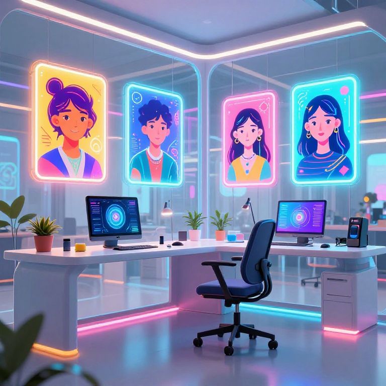 Neon-lit modern office with four glowing, colorful portraits of women on the wall, two white desks, two monitors, and a black chair.
