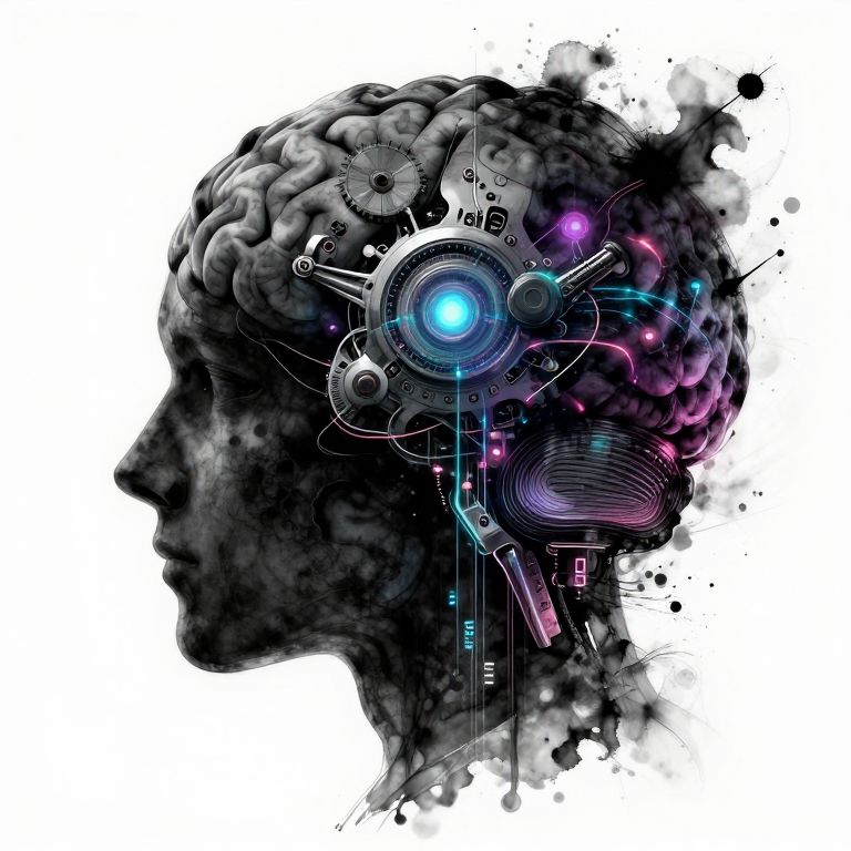 Digital artwork depicting a black, side-profile silhouette of a human head with a detailed, futuristic brain. The brain is intricately blended with mechanical and cybernetic elements, featuring a large, glowing blue circular device at the center. Surrounding this device are neon pink and purple circuitry patterns, with black ink splatters extending from the right side. The texture of the brain contrasts with the sleek, metallic textures of the cybernetic components. The background is stark white, emphasizing the dark silhouette and vibrant internal mechanisms. The style is a fusion of sci-fi and surrealism, with a strong emphasis on contrast and intricate detail.