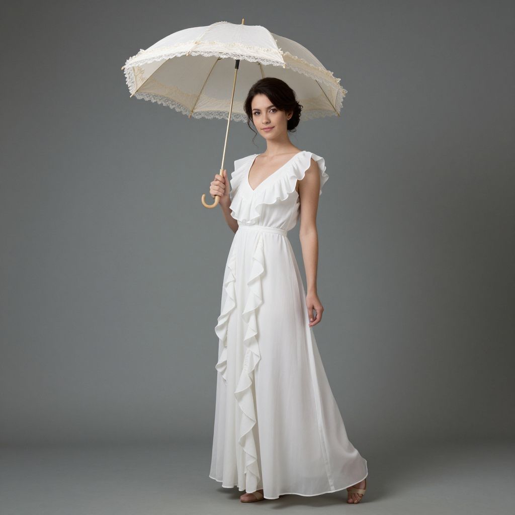 Woman holding a cream-colored parasol with lace trim stands gracefully against a muted gray backdrop, her ruffled white dress flowing elegantly beneath the delicate shade.