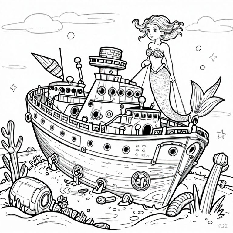 Overhead View A beautiful mermaid with fin exploring a sunken shipwreck for a coloring book with crisp lines aa 17:22,