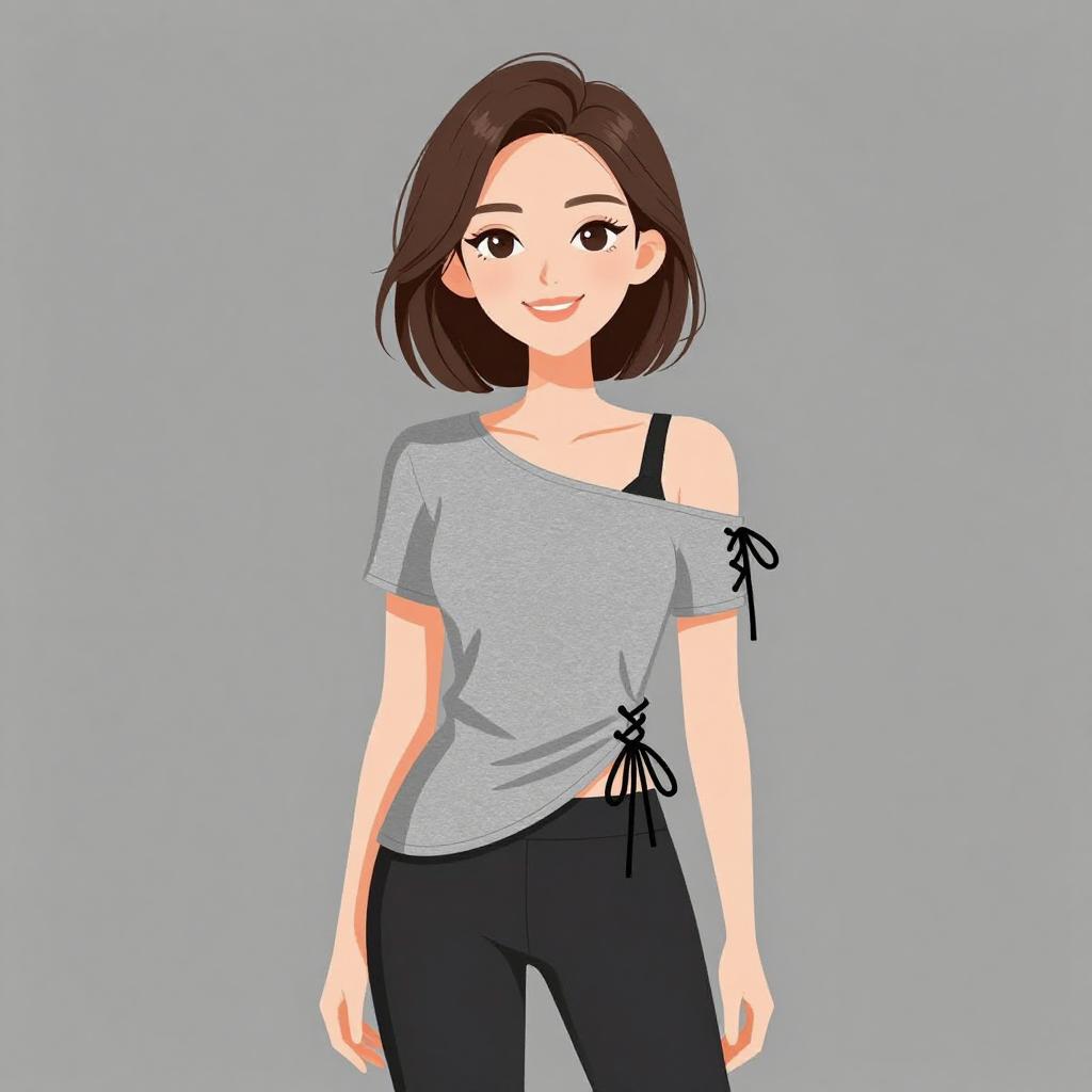 Woman with pretty face and pretty hair. smiling Woman, casual chic, black spaghetti strap camisole, relaxed fit, layered flounce, paired with black and gold speckled high-waisted shorts, faux leather trim pockets, solid black waistband, minimal jewelry with a short chunky necklace, grey studio background. --sref 1467