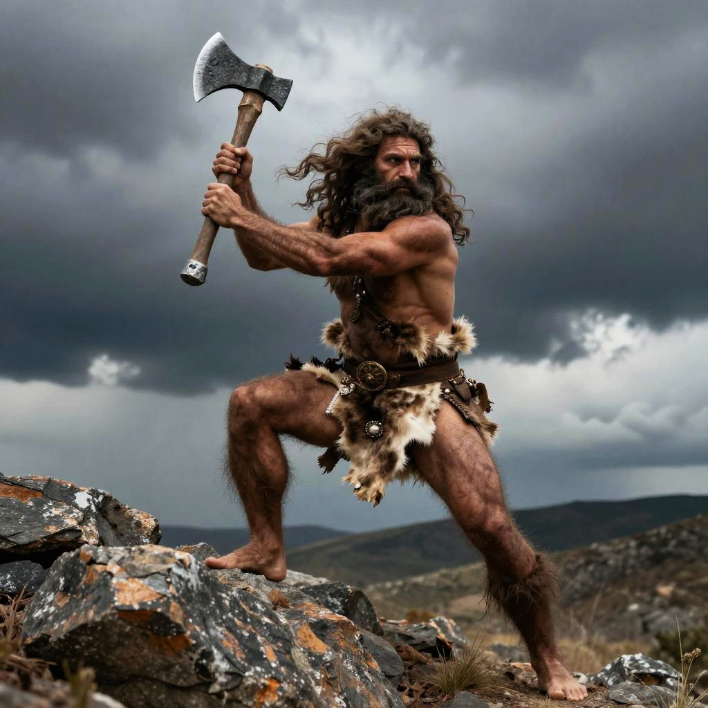 Archer's axe resting on a tree stump in a dense forest at golden hour, intricate wood and metal textures, detailed fantasy style, warm lighting