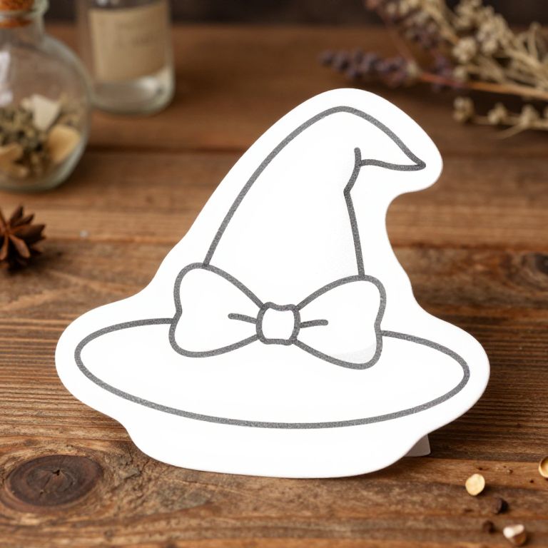 Whimsical white outline of a witch hat with a bow, placed on a rustic wooden table with dried herbs and spices in the background.