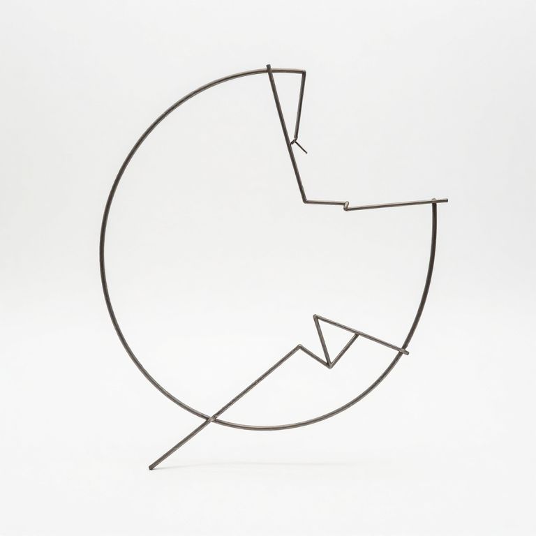 A minimalist abstract sculpture made of twisted metal wires, symbolizing the feeling of failure with sharp angles and broken lines against a plain white background.