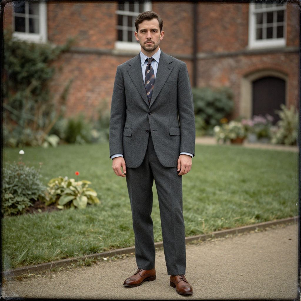 Photograph of a Caucasian man with short dark brown hair and a trimmed beard, standing in front of a brick building with white-trimmed windows. He wears a dark gray, two-button suit with a white dress shirt and a patterned tie. His brown leather shoes are polished. The background features a well-maintained grassy garden with various plants and flowers, and a paved pathway beneath his feet. The man stands with a serious expression, his hands relaxed by his sides. The photo has a slight vignette effect, adding a vintage feel.