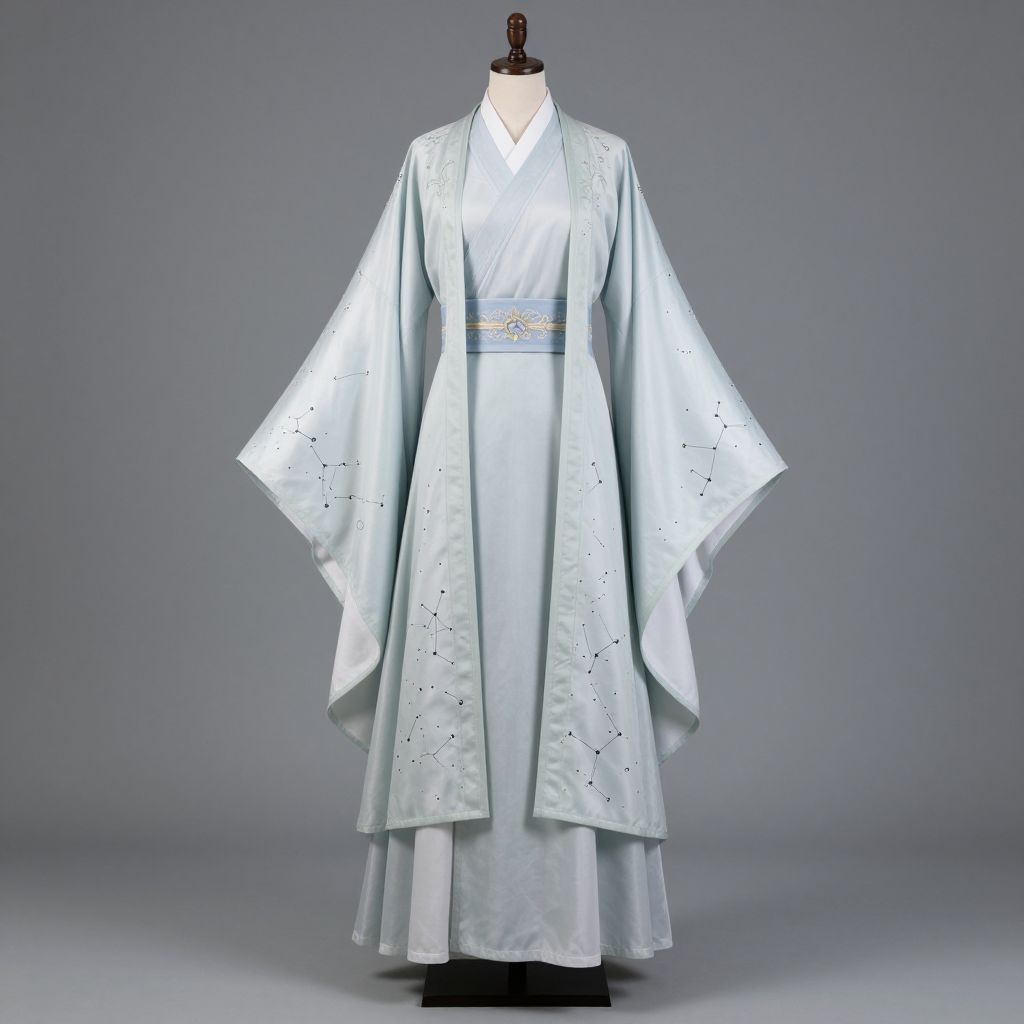 Concept art for a larp costume, long layered robes decorated with constellation patterns, light pastel color scheme, long sleeves, elegant, graceful, serene, refined, poised, focused, subtle, poise