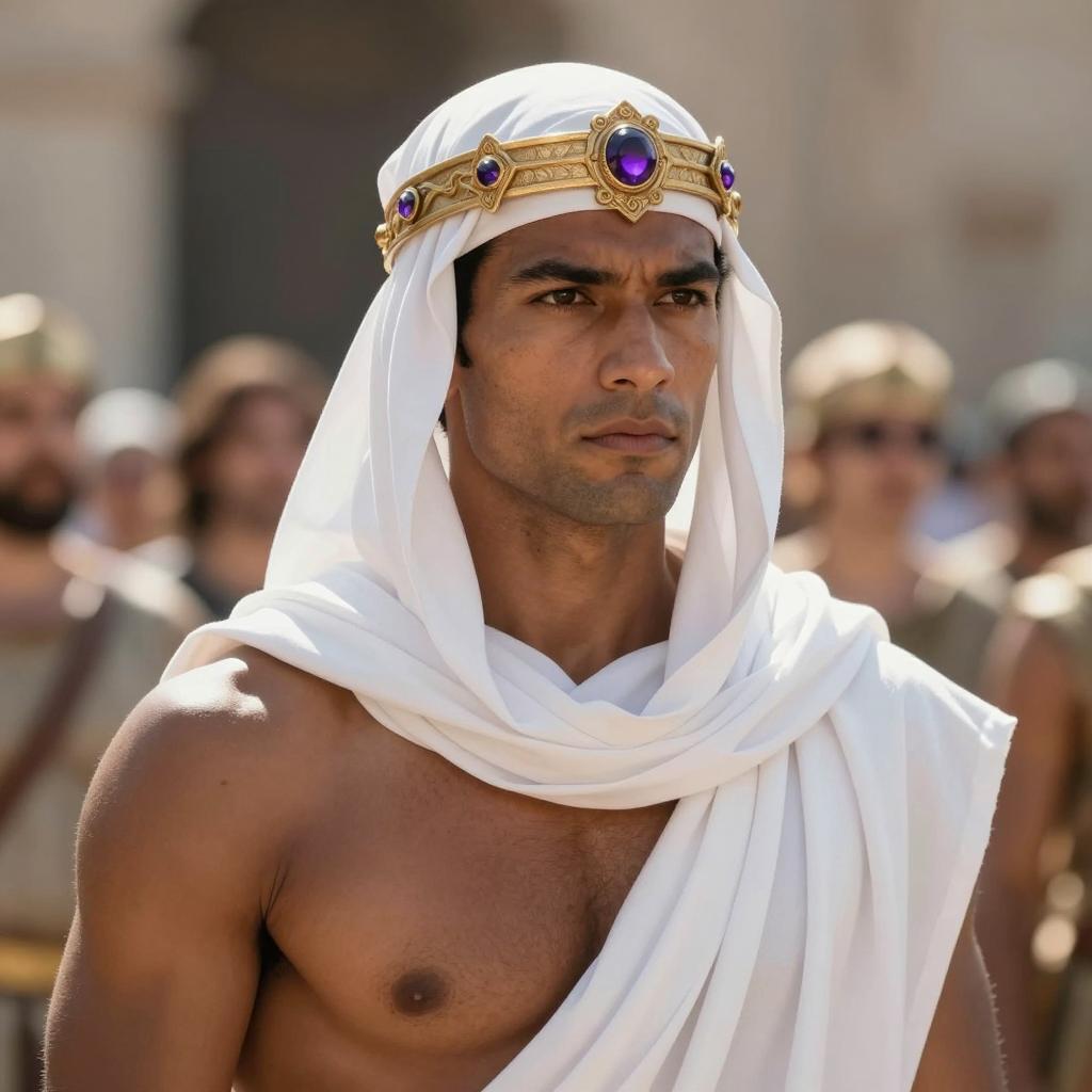 God ares costume, photorealistic, muscular man with dark skin, white headscarf, ornate gold crown with purple gem, bare chest, white draped cloth, serious expression, background blurry crowd, sunny outdoor setting, classical or ancient theme, movie still, close-up, high contrast, natural lighting