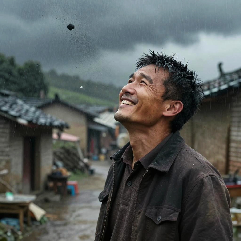Photograph of an Asian man with wet, spiky black hair and a broad, joyful smile, looking up at the sky. He wears a dark brown, worn denim shirt. The background shows a rainy village scene with rustic, tiled-roof houses, blurred in the wet, overcast atmosphere. Raindrops are visible on the camera lens, adding a textured effect. The man's skin is slightly tanned, and the village path is muddy, with scattered objects and a faintly visible green hill in the distance. The overall mood is rustic and nostalgic.