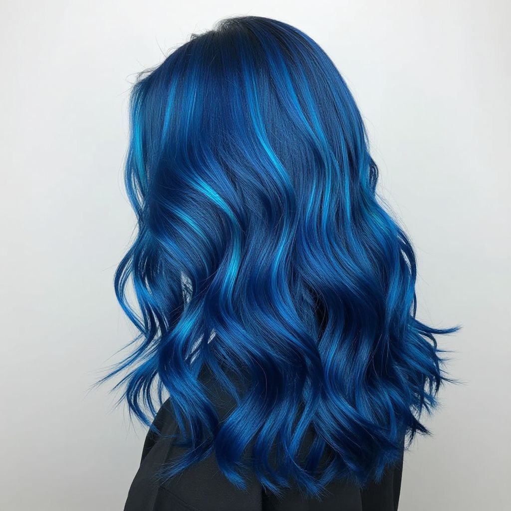 Change hair color in photo to a deep ocean blue with shimmering turquoise streaks, glossy finish, styled in loose curls, portrait against a minimalist light gray backdrop, high detail focus on hair strands and light reflection, photorealistic style.