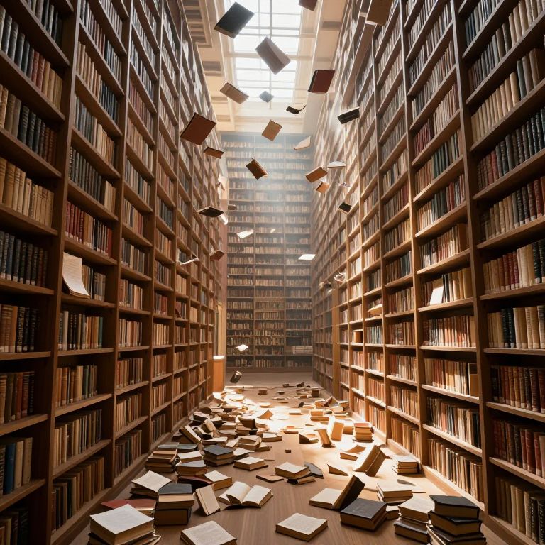 A labyrinthine library bathed in ethereal light, where gravity defies expectation as books float mid-air and spill onto the ground, creating a surreal pathway into an endless realm of knowledge and mystery.
