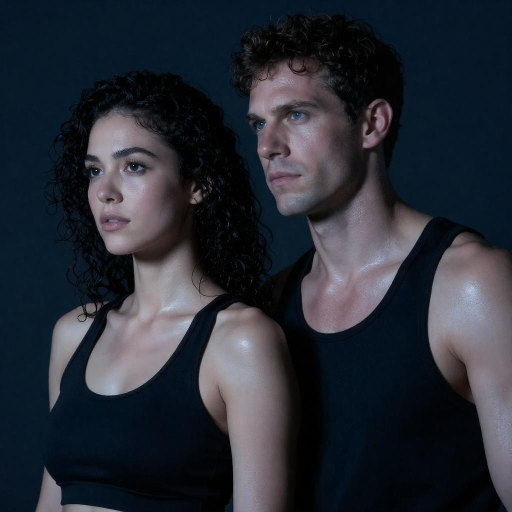 Photograph of two people in a gym. Woman with dark hair in black lace dress stands to the left, looking serious. Man with light brown hair in white shirt and blue vest stands to the right, adjusting his cufflinks. Red and black gym equipment, including hanging punching bags, in the background. Woman in foreground, man slightly behind and to the right.