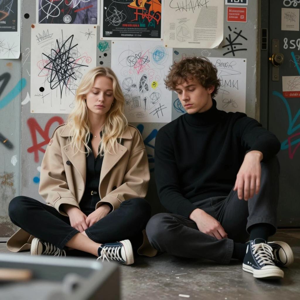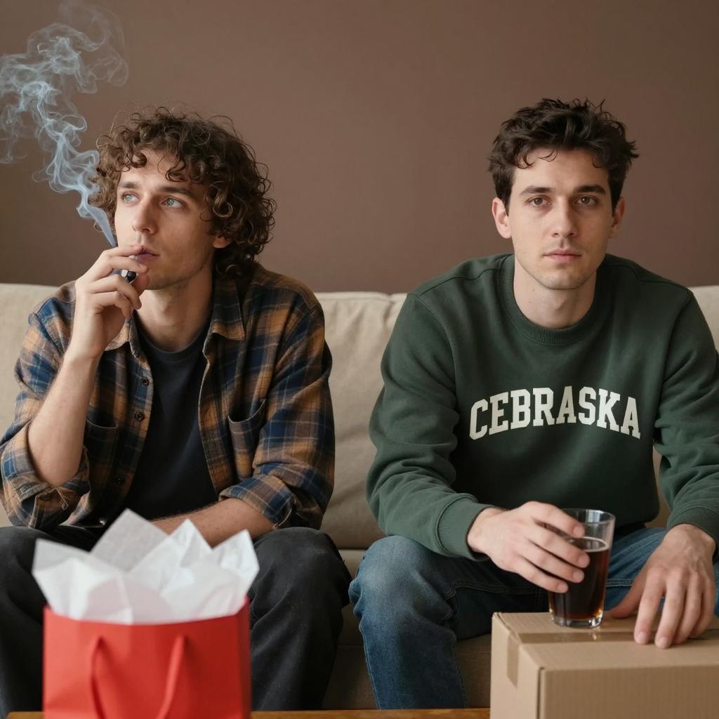 Two young men with curly hair and light skin interact on a city street. The standing man, wearing a brown leather jacket and gray shirt, extends a cigarette towards the seated man who is smoking and dressed in a brown jacket. They are positioned outside a store with glass windows and visible posters in the background. A black bag is placed nearby on a bench.
