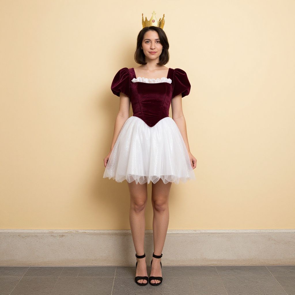 Photograph of a young woman with a fair complexion and straight black hair, wearing a small golden crown. She is dressed in a maroon velvet off-the-shoulder top with puffed sleeves and a white, tiered tulle skirt. She stands against a plain, light beige wall, with her feet on a gray tiled floor. She wears black, open-toed high-heeled sandals. Her expression is neutral, and she stands with her arms relaxed at her sides. The image is brightly lit, with sharp focus and vibrant colors.