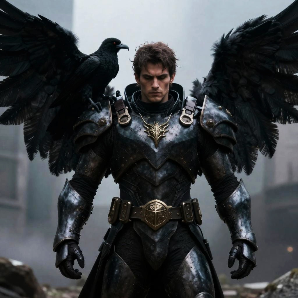Man Dark Angel, male in armor with a large black bird on his shoulder