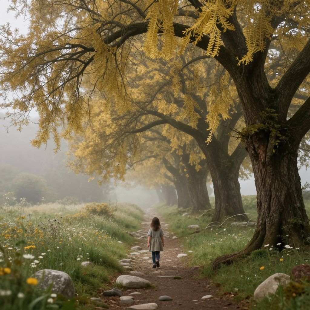 In a serene valley where nature weaves whimsy, golden mistletoe-shaped leaves dangle from ancient trees, casting a spell of enchantment over a child who wanders along a path strewn with stones and wildflowers.