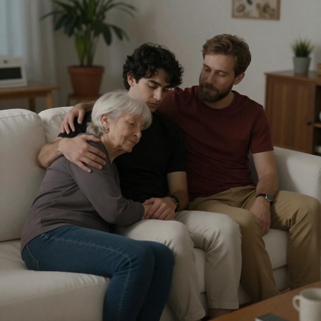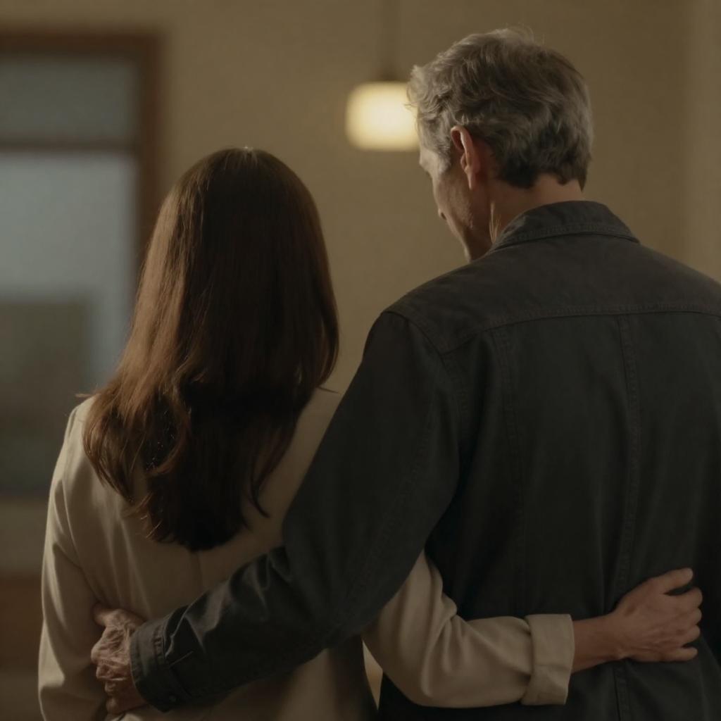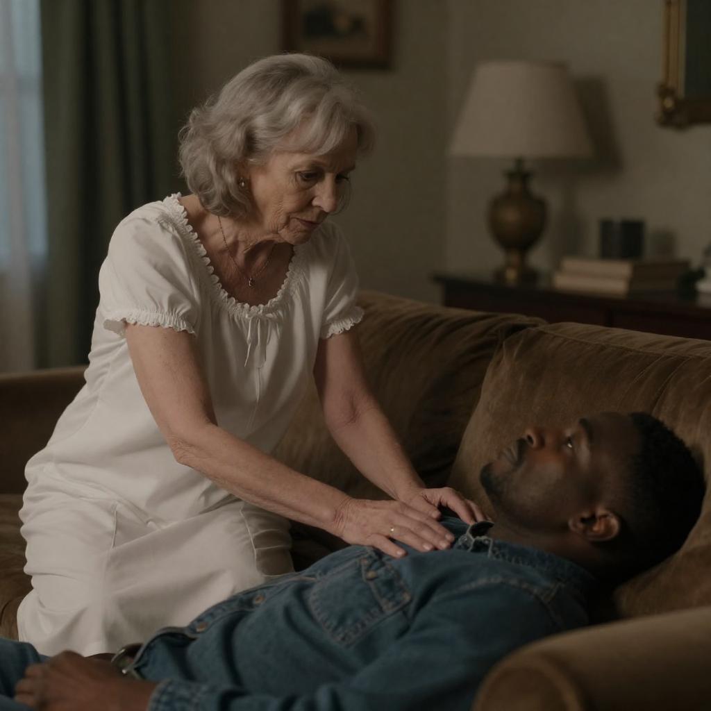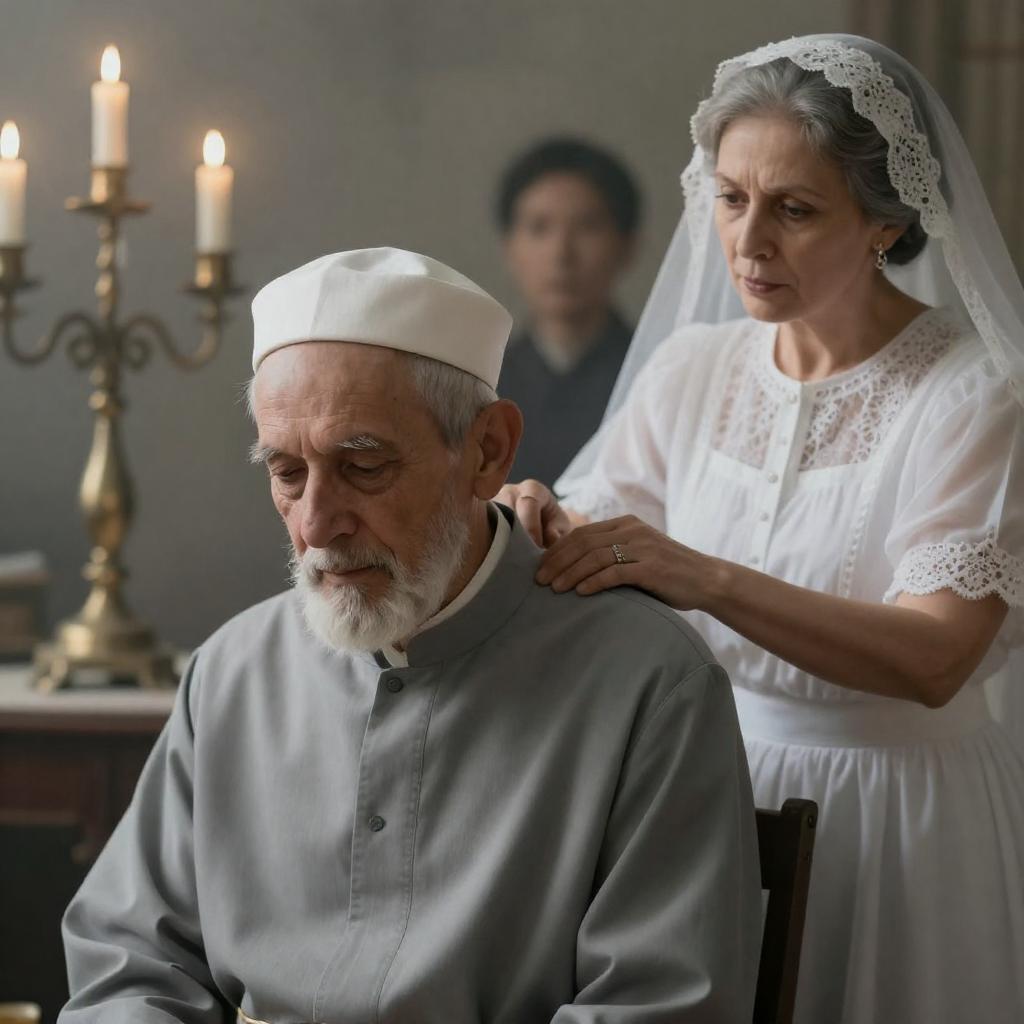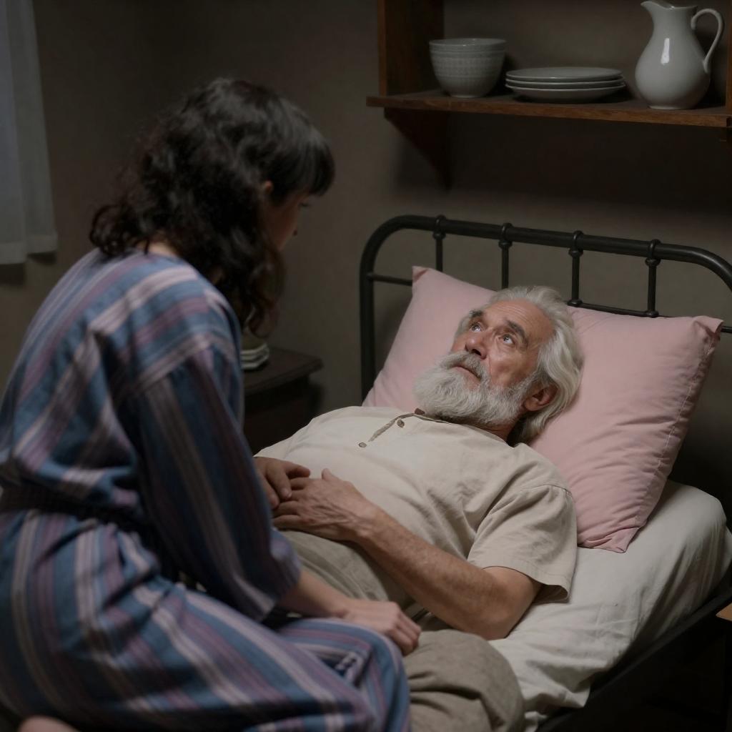 Old man with white beard and long white hair, lying in bed, wearing beige shirt, looking at woman with dark hair, striped blue and purple robe, sitting beside him. Dark room with metal bed frame, pink pillow, wooden shelf with dishes and jug. Woman facing him, man looking up. Dim lighting.