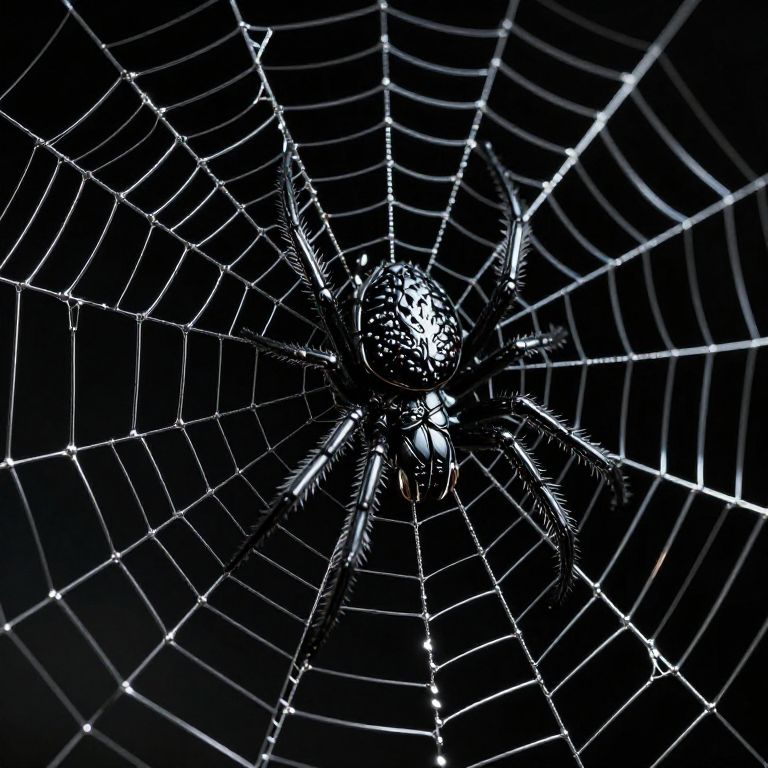 Black widow web design concept with a venomous spider spinning a complex metallic web, dark background, sharp angular patterns, cyber aesthetic, highly detailed sci-fi style.