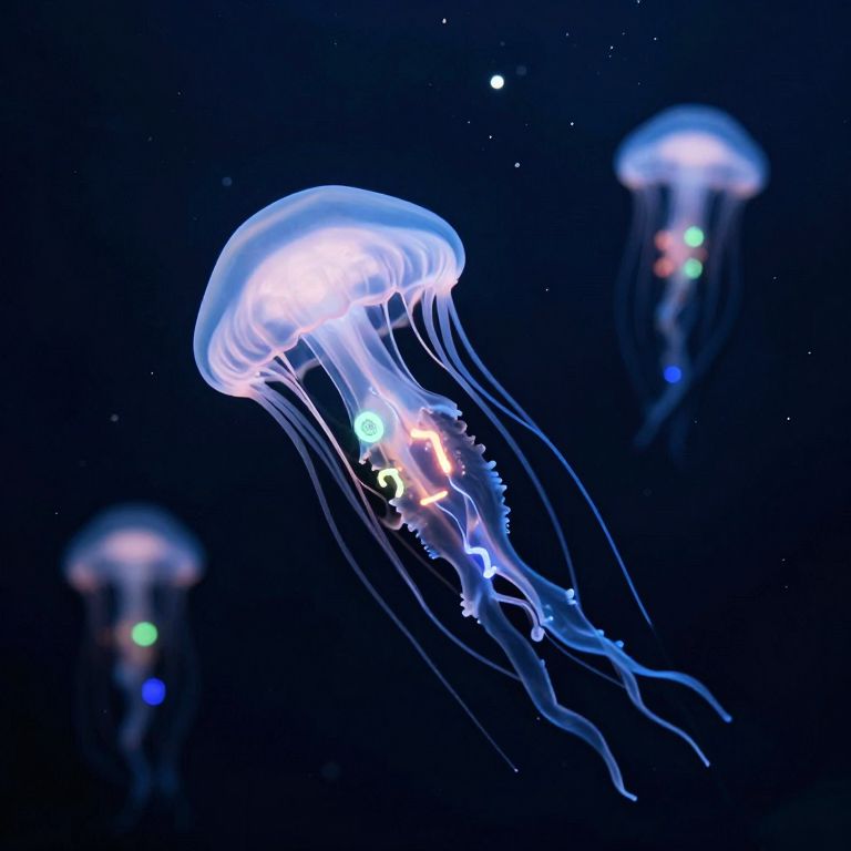 A school of physics-defying jellyfish glide through liquid stars, trailing glowing numbers that change with every heartbeat.