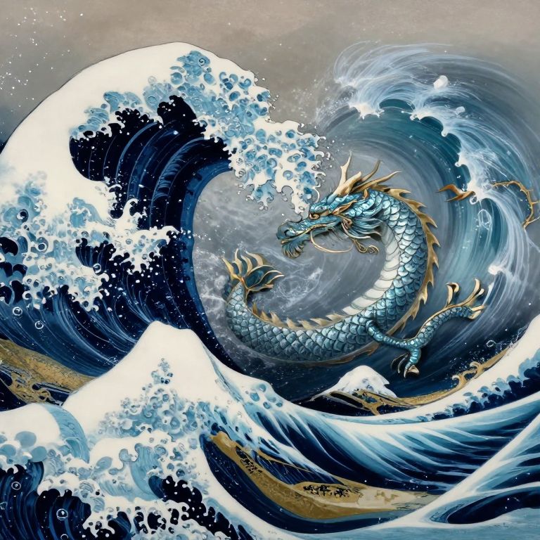 Digital art of koi fish swimming in a serene pond with large blue waves, surrounded by lily pads and water lilies.