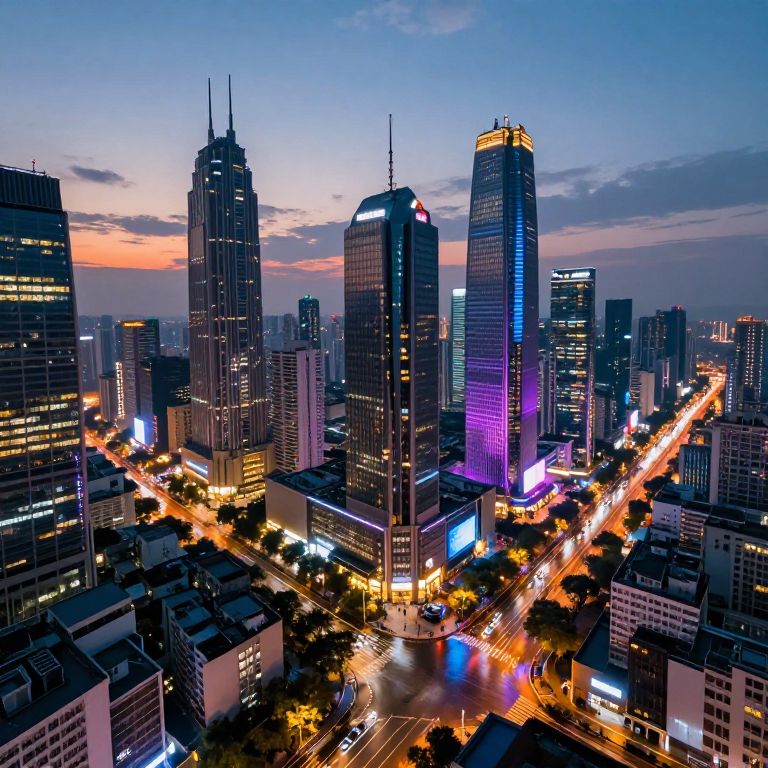 Photograph of a vibrant cityscape at dusk, featuring illuminated skyscrapers, colorful neon lights, busy streets with light trails, and a twilight sky
