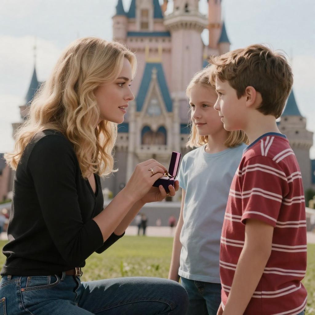 Photograph of a movie poster featuring a blonde woman with wavy hair in a black top, kneeling and holding a ring, looking at a young boy with brown hair in a red striped shirt. A blonde girl in a light blue shirt stands beside him. They are outdoors with a castle in the background.