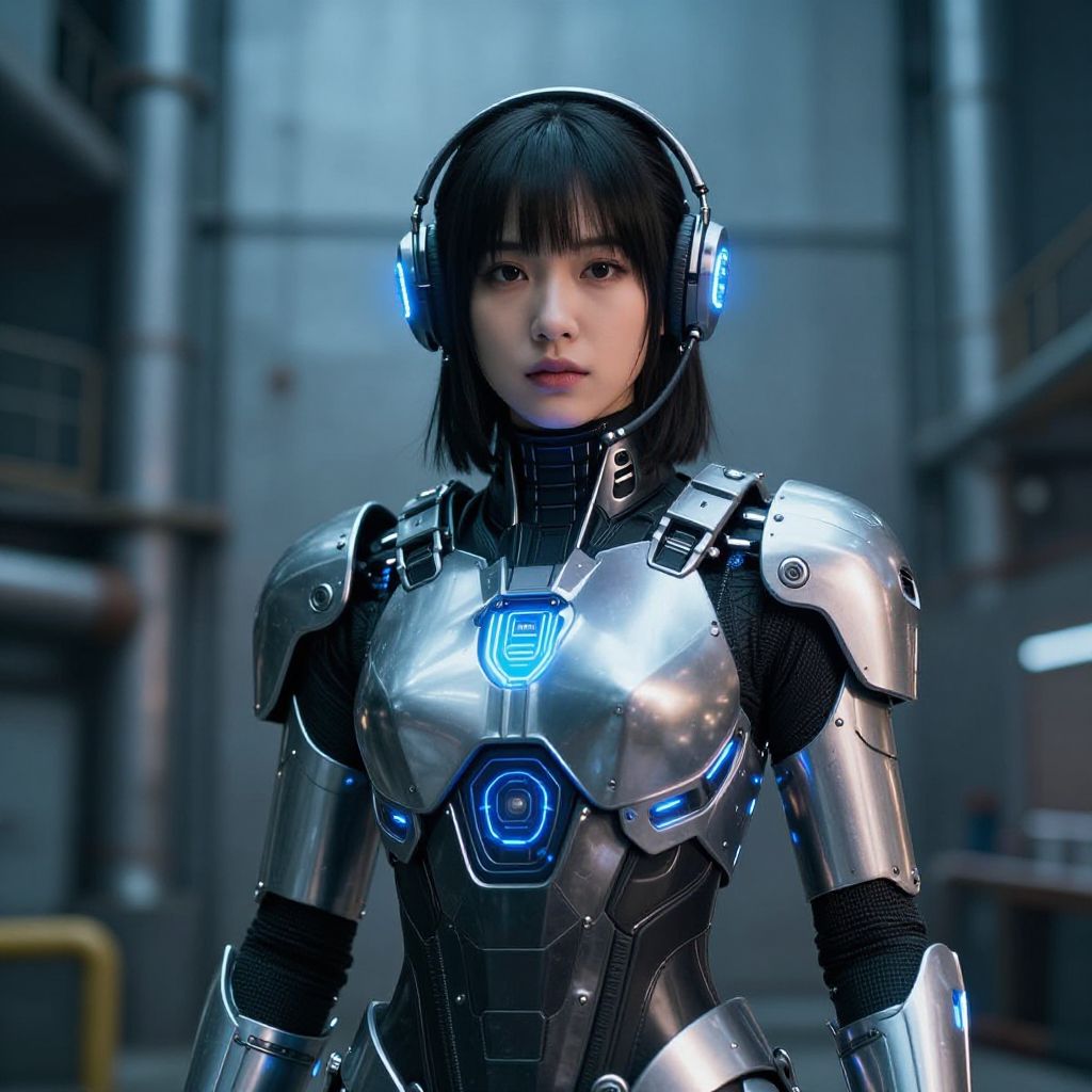 Portrait of a young woman dressed as a futuristic cyborg with metallic armor and glowing blue lights, standing in an industrial environment with tall structures and pipes. The cyborg costume includes a helmet with illuminated ear pieces and a chest plate featuring advanced technology details. The mood is sci-fi with a mix of human and robotic elements.