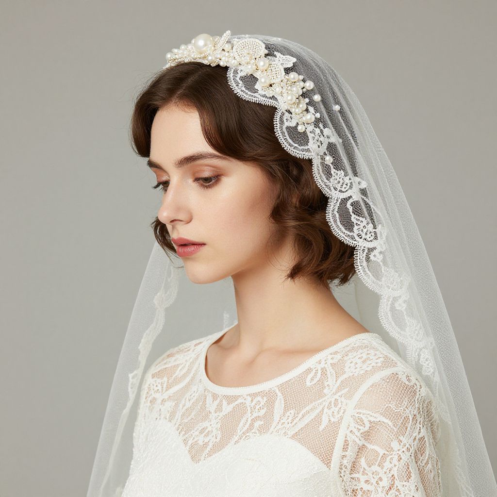 Woman wearing a delicate white lace veil with pearl embellishments, styled over her short brown hair, paired with a lace top, showcasing a vintage-inspired bridal accessory available wholesale at Narvay.com.