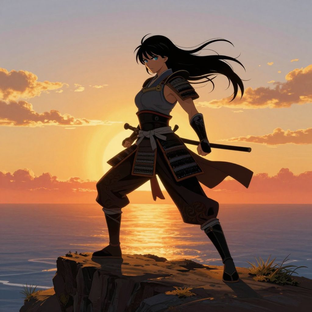 A powerful female warrior stands atop a cliff at sunset in this unique digital art piece, blending manga and impressionist styles. With flowing black hair and piercing blue eyes, she is depicted in a dynamic action pose overlooking an ocean horizon bathed in warm golden hues. Dramatic shadows cast across her muscular build, highlighting traditional Japanese armor adorned with intricate patterns, as the aerial perspective above the horizon line evokes awe-inspiring strength and serene beauty. The vibrant colors of the sky seamlessly blend with the silhouetted figure, capturing the essence of nature's grandeur and human resilience in a single captivating image.