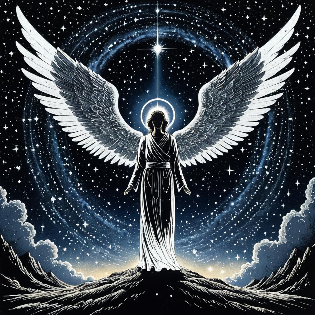 Illustration of a radiant angel with large silver wings and a glowing halo standing on a rocky surface, surrounded by an infinite starry sky and swirling galaxy. The angel is accompanied by a mysterious shadow figure with glowing eyes, depicted in a detailed and emotional art style inspired by Hiromu Arakawa.