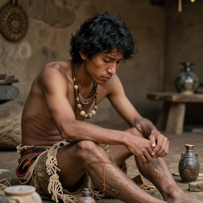 Rustic Guweiz style. A precolombian young man. He is alchemist. He is suffering psychologically. He is lean.,